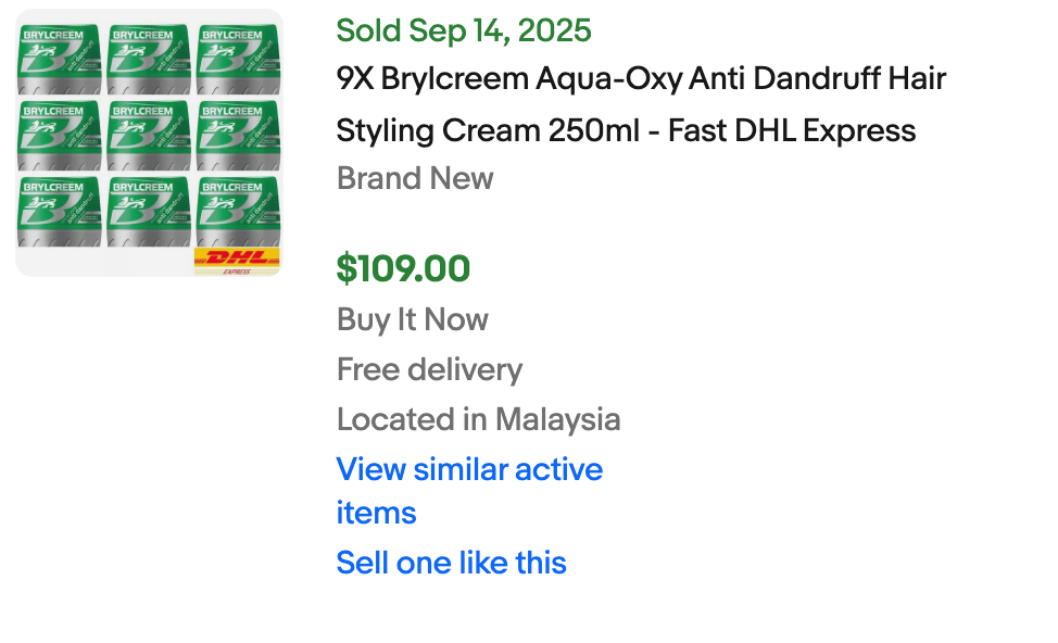 Satu lagi produk harian yang ramai tak sangka laku di pasaran luar negara ialah Brylcreem Aqua-Oxy Anti Dandruff Hair Styling Cream 250ml. Di Malaysia, krim rambut jenama Brylcreem ini sangat mudah ditemui di kedai runcit biasa atau 99 Speedmart dengan harga mampu milik.