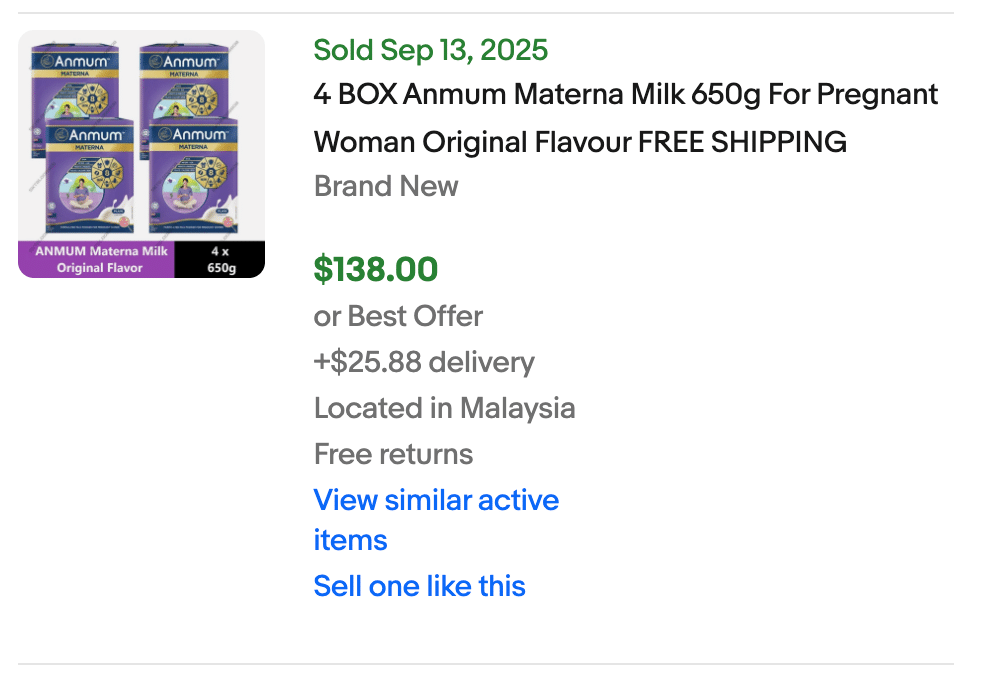 Jika ditukar kepada mata wang Ringgit (1 USD = 4.05), jumlah keseluruhan mencecah kira-kira RM665. Walaupun nampak macam produk biasa di rak farmasi Malaysia, pembeli luar negara sanggup bayar harga jauh lebih tinggi kerana sukar mendapatkan susu khas untuk ibu mengandung ini di negara mereka.